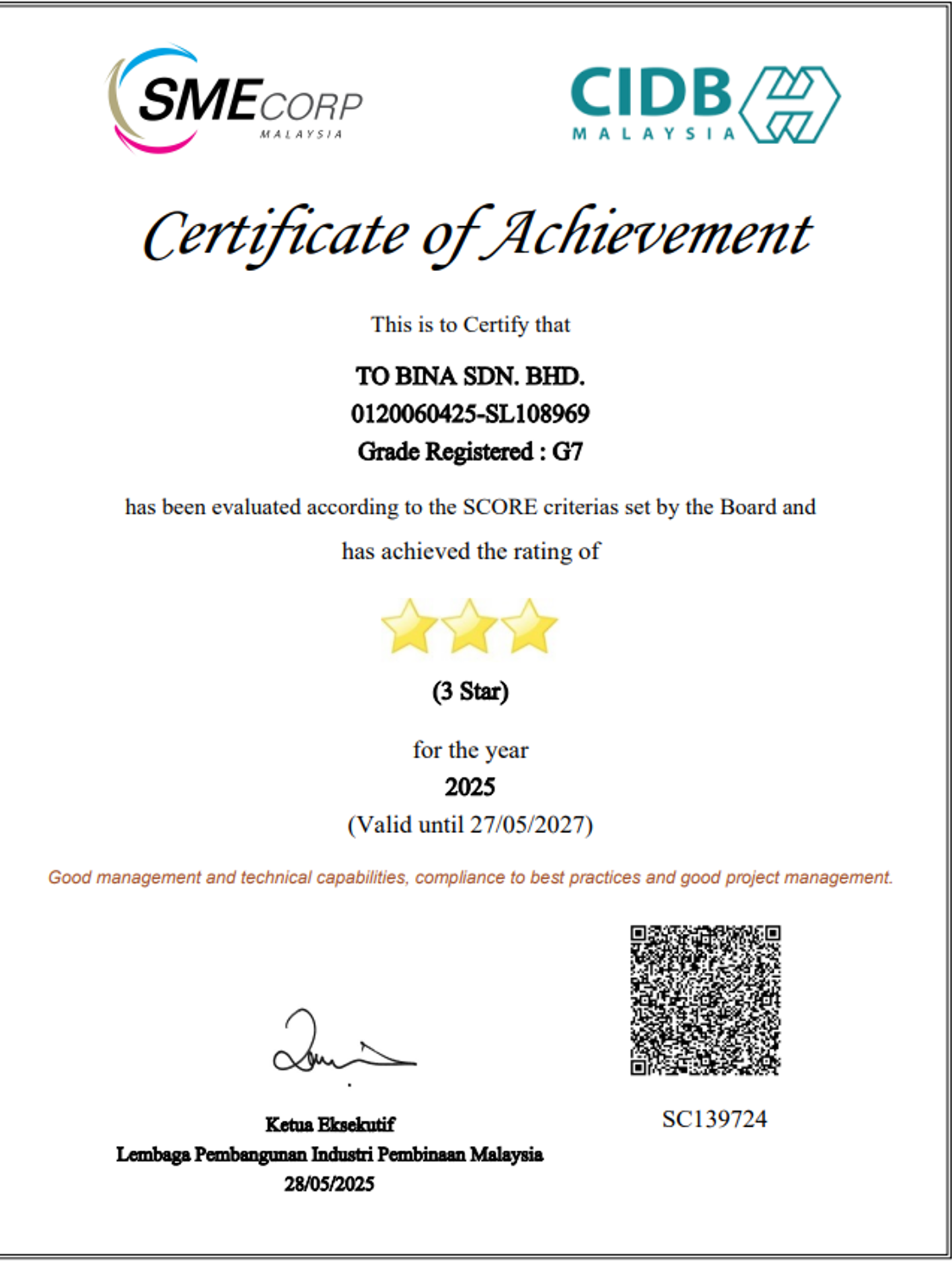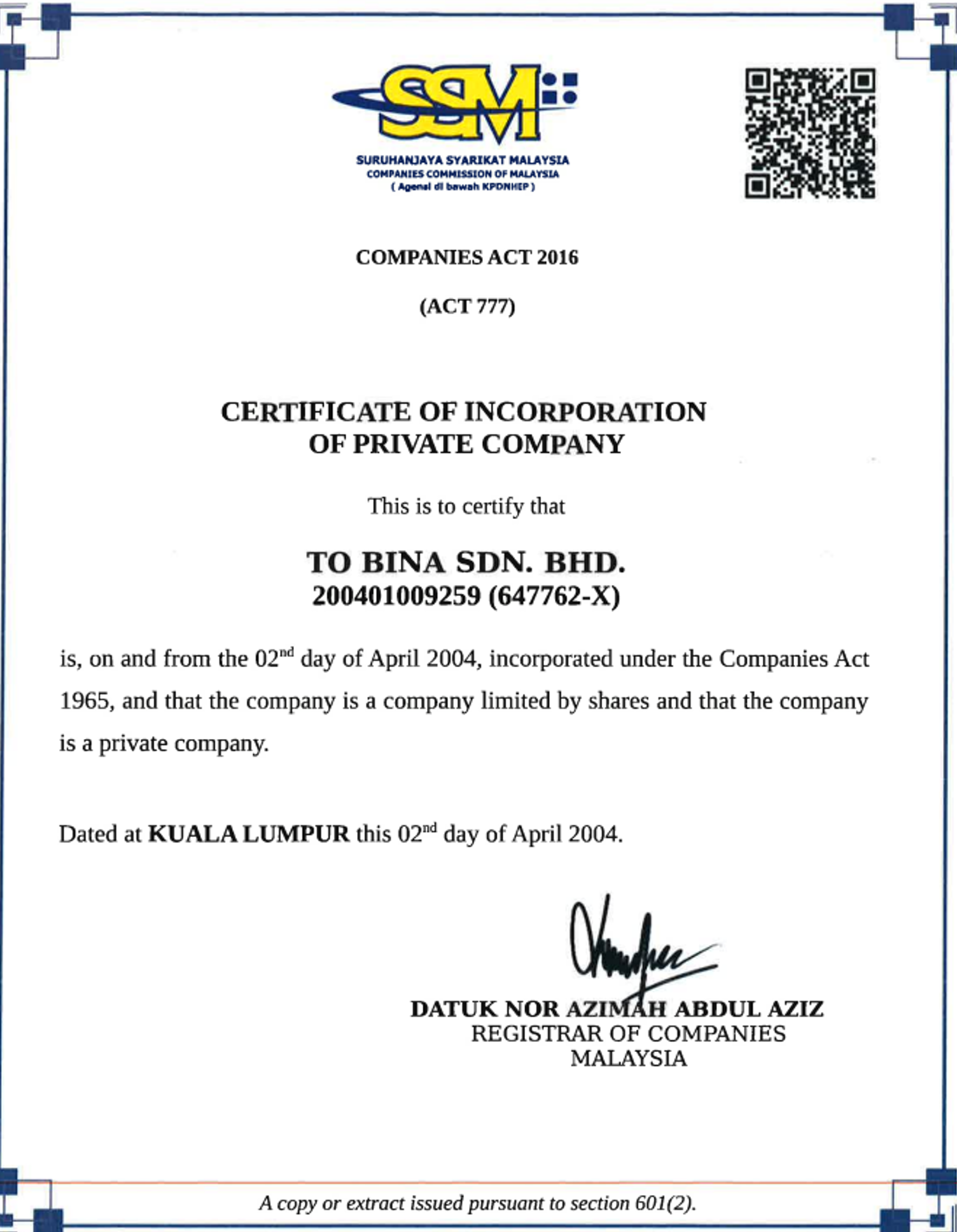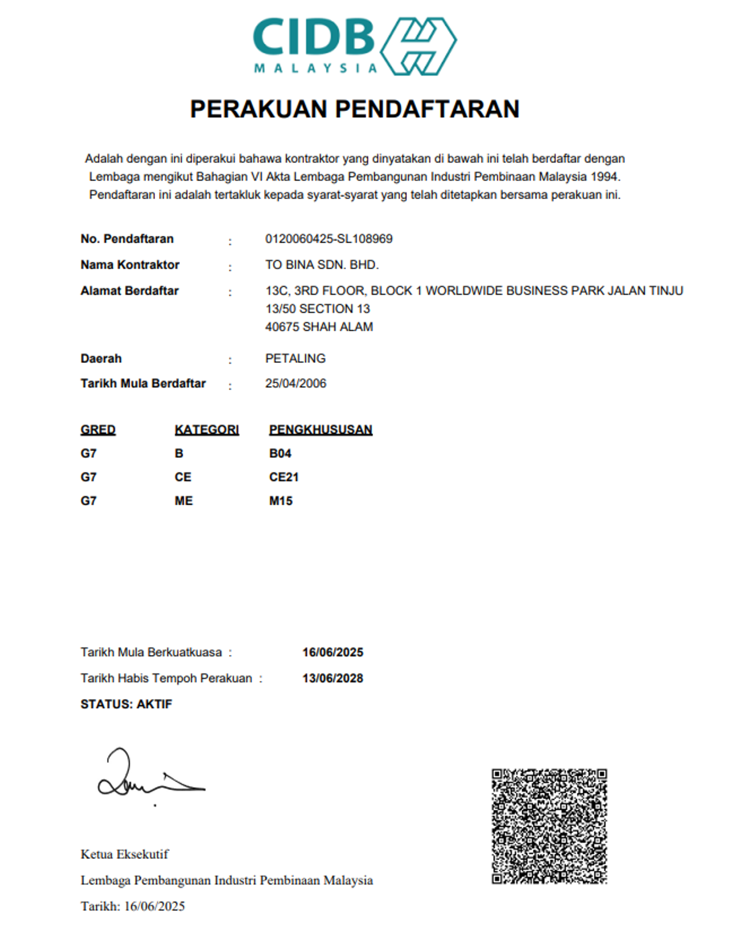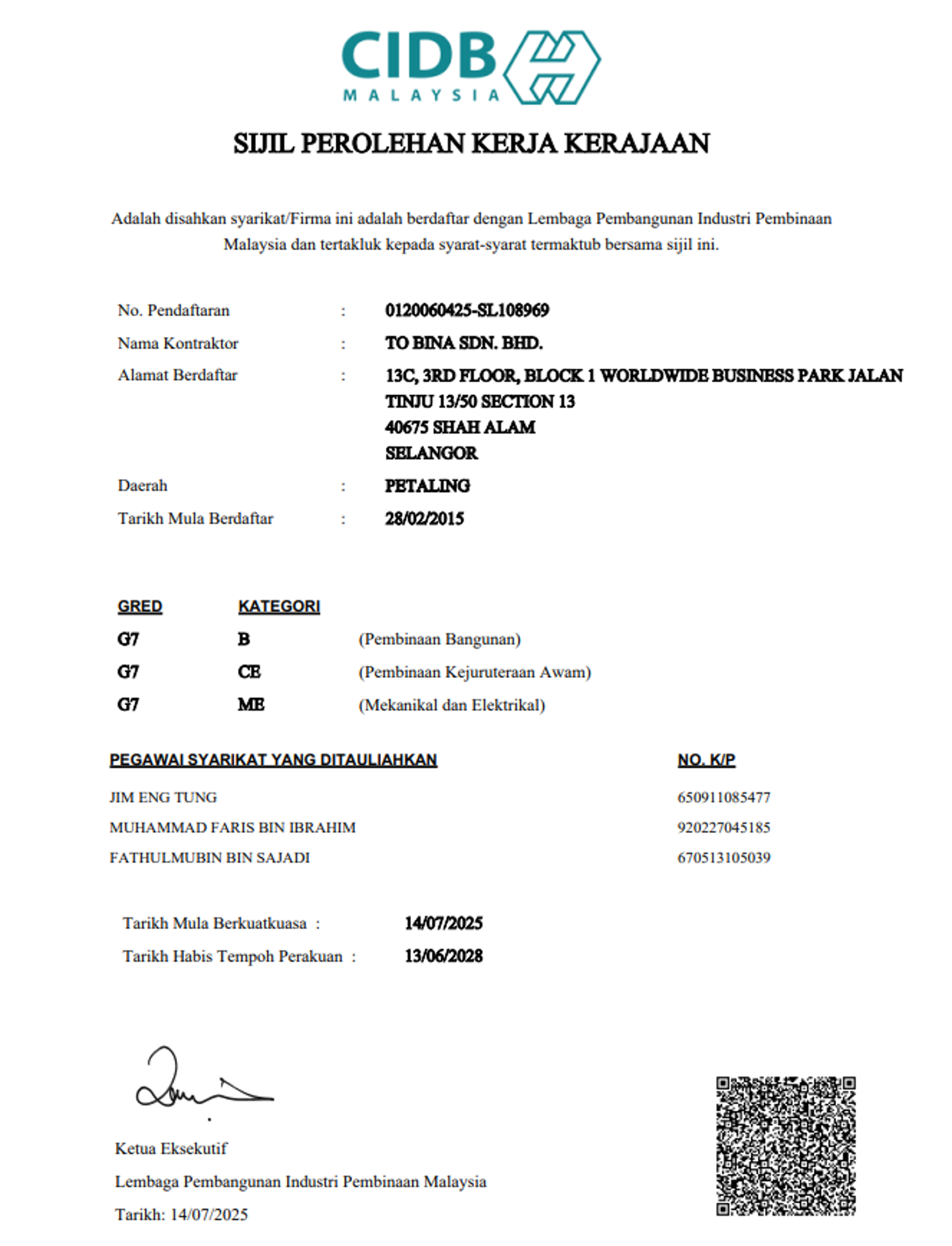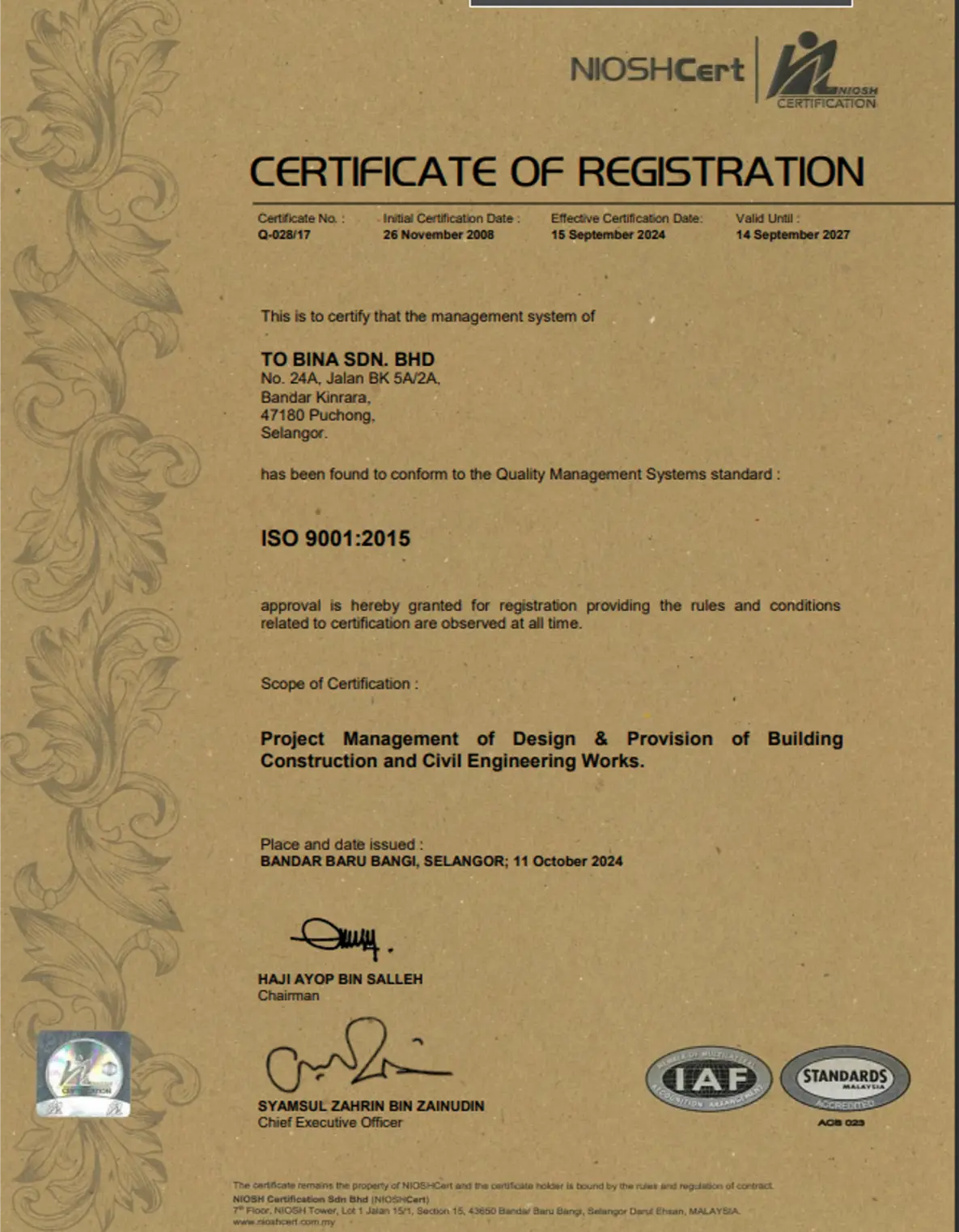 Home / Certification Certification Certificate of Incorporation of Private Company (SSM) View Certificate CIDB Certificate of Registration View Certificate CIDB Certificate of Government Procurement Works View Certificate CIDB Certificate of Achievement View Certificate ISO 9001:2015 View Certificate
